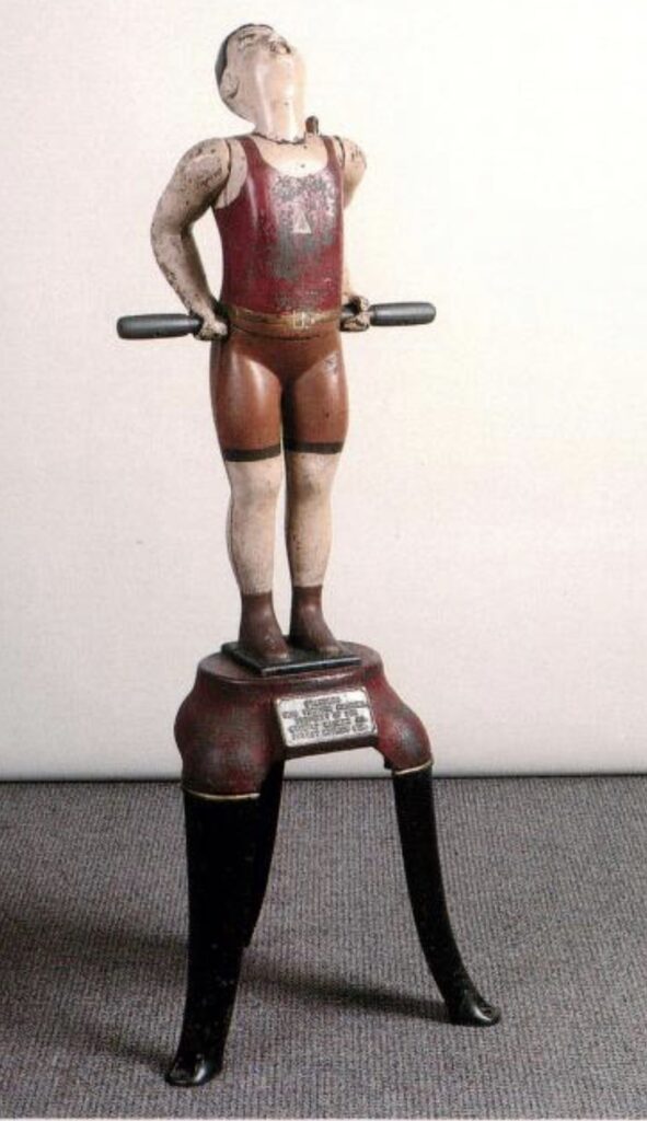 The Beverly standard grip test is an incredible piece of early arcade equipment. The user grips two handle bars at the sides of a cast iron strong man. When the user rotates the bars toward them, with spring resistance, the figure sticks out his tongue with a scale, measuring the users grip strength.